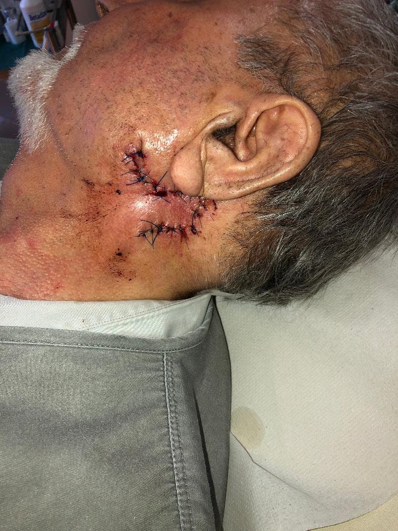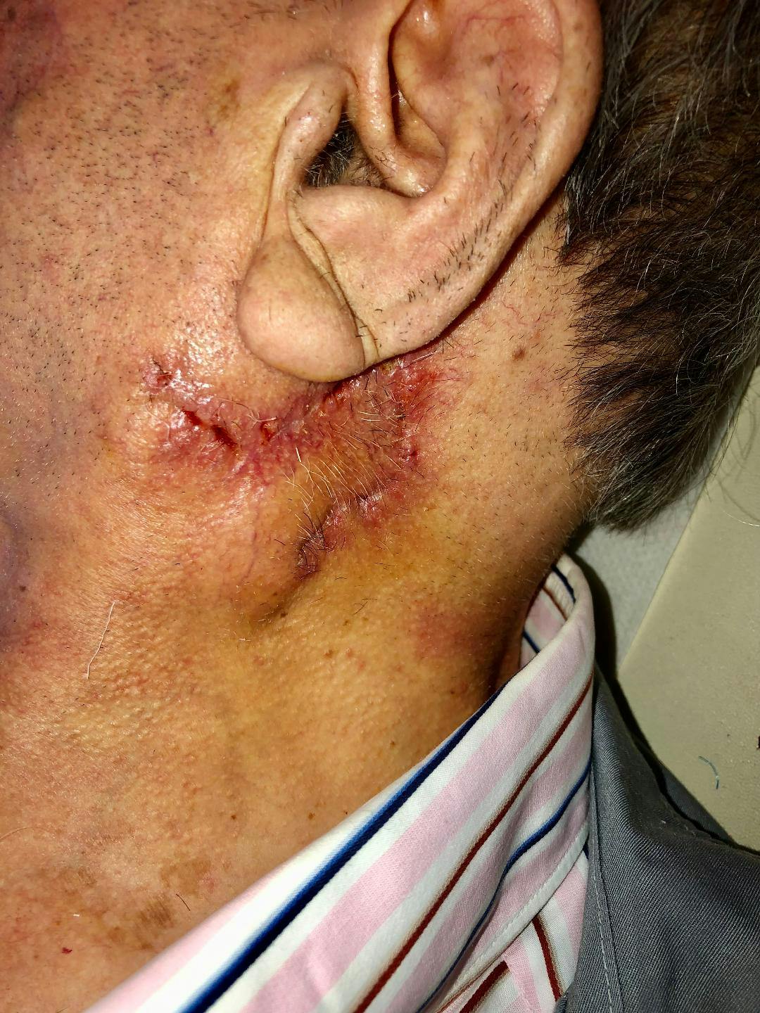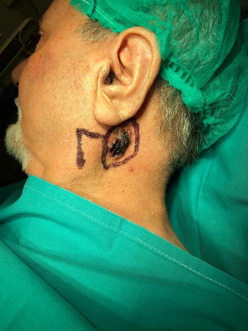 Ηλικιωμένος άνδρας 89 ετών προσήλθε με οπισθοωτιαίο δερματικό όγκο. Η βλάβη αφαιρέθηκε σε υγιή όρια και το έλλειμμα αποκαταστάθηκε με τοπικό μεταθετό ρομβοειδή κρημνό Limberg. Η βιοψία έδειξε βασικοκυτταρικό καρκίνωμα.