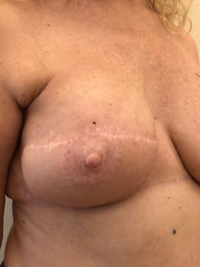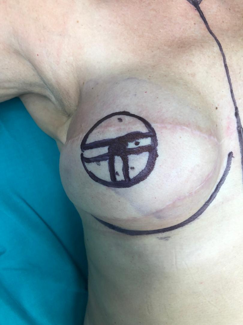 Γυναίκα ασθενής 54 ετών υποβλήθηκε σε αποκατάσταση θηλής (δε) μαστού. ‘Εχει προηγηθεί (δε) μαστεκτομή – ά χρόνος αποκατάσταση με ιστικό διατατήρα και αυτόλογο ιστό – πρόγραμμα διατάσεων και ΄β χρόνος αποκατάσταση με μόνιμο ένθεμα σιλικόνης. Η ασθενής έχει υποβληθεί σε ακτινοθεραπεία και χημειοθεραπεία. Ακολουθεί πρόγραμμα ορμονοθεραπείας.