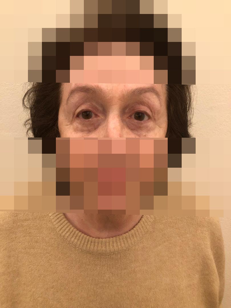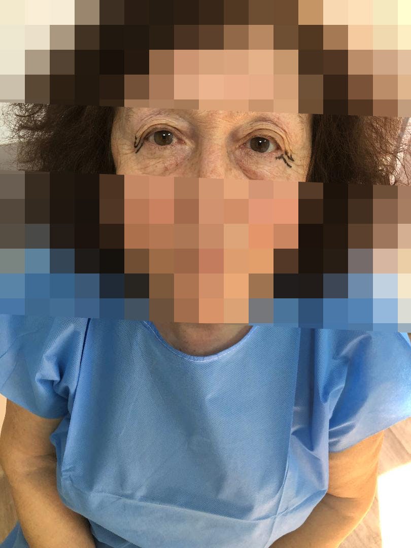 Από το άνω βλέφαρο αφαιρέθηκε με ατρακτοειδή εκτομή η περίσσεια του δέρματος. Στο κάτω βλέφαρο αφαιρέθηκε το προεξέχων λίπος των λιποαποθηκών του κάτω βλεφάρου, προκειμένου να εξαλειφθούν οι αντιαισθητικές σακούλες. Η επέμβαση στο κάτω βλέφαρο συμπληρώθηκε με συντηρητική αφαίρεση μικρής περίσσειας δέρματος.